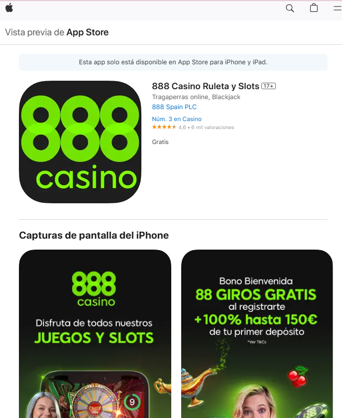 En cuanto a la 888 Casino app, esta se encuentra disponible en la tienda oficial de Apple.