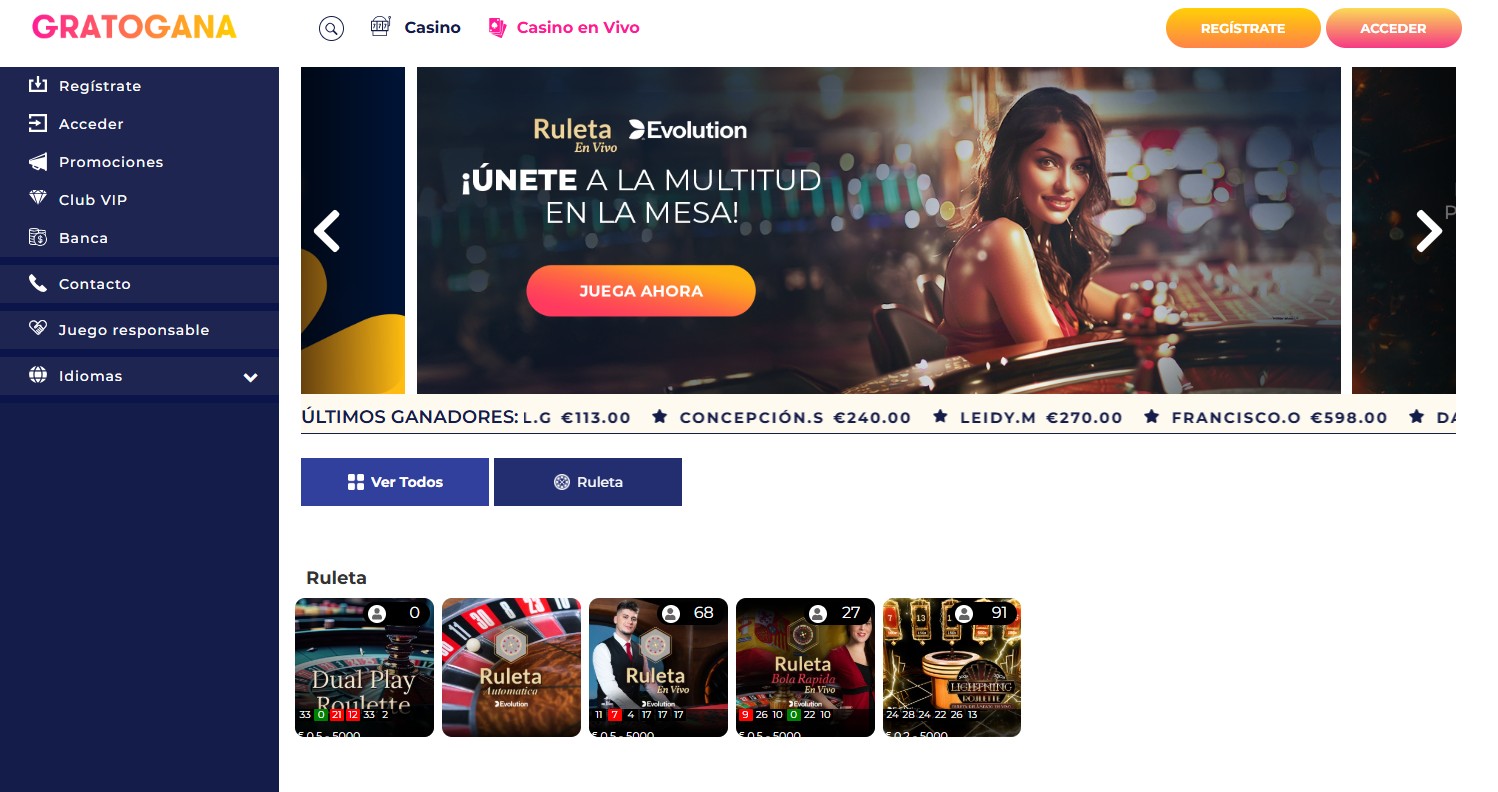 El diseño moderno y cuidado del sitio web de GratoGana avanza en la facilidad de uso. Con una arquitectura sencilla y una navegación rápida, el sitio facilita a los usuarios la localización de juegos, promociones e información sobre su cuenta. La clara segmentación de las categorías (tragaperras, blackjack, ruleta, casino en vivo y rasca y gana) permite a los jugadores navegar rápidamente por el sitio. La función de búsqueda de juegos ofrece a los usuarios una experiencia impecable al permitirles filtrar los juegos según el proveedor, el tipo y la popularidad. Sin embargo, no es una delicia en comparación con otras empresas con catálogos de juegos más amplios, como LeoVegas.