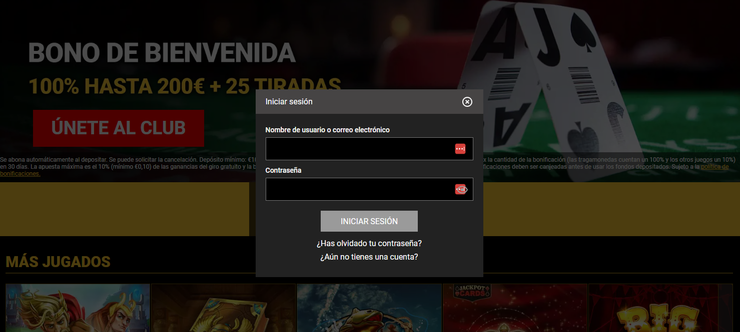 | Bonificación de bienvenida | 100% hasta 200 € + 25 tiradas gratis en Big Bass Bonanza. Tiradas: valor de 0,1 €, apuesta 60x. | Depósito mínimo 10 euros. Apuesta máxima del 10% de las ganancias o 5 € (se aplica el mínimo). Canjear en un plazo de 30 días. | 200 € + 25 Tiradas Gratis |