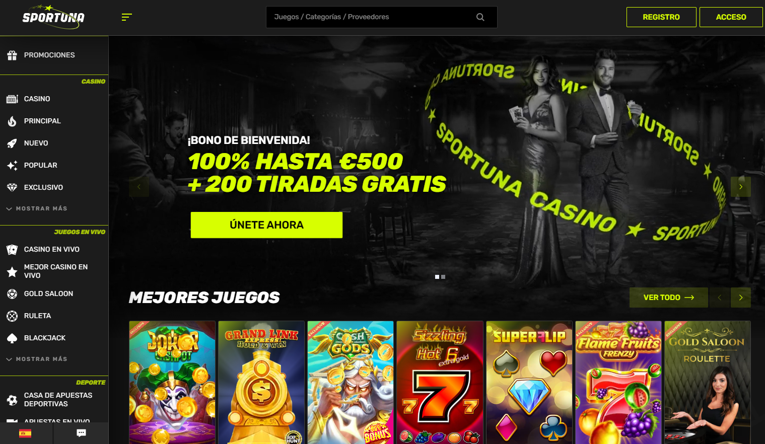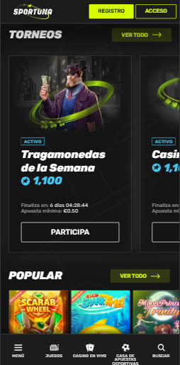 El acceso y registro de cuentas en Sportuna Casino se realiza mediante botones disponibles en la zona superior de la web, mientras que la parte central recoge las promociones y juegos en tendencia, y la barra lateral agrupa los títulos atendiendo a las diferentes temáticas. Cuenta con un buscador de juegos y filtros adaptables