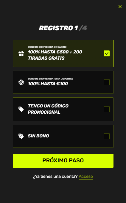 El usuario puede seleccionar promociones de bienvenida para casino, deportes o introducir un código promocional
