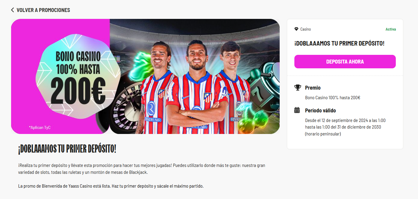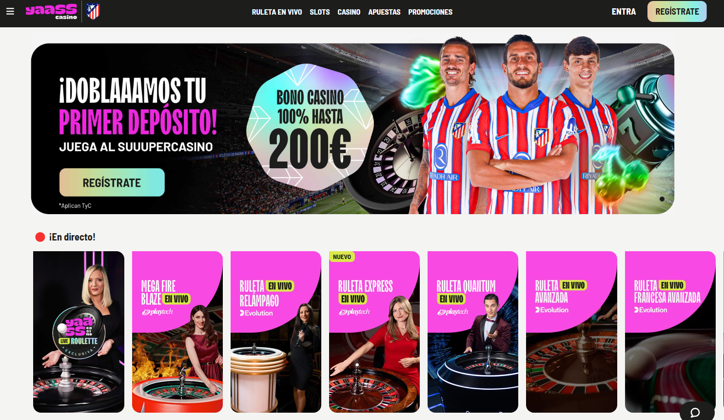 El respaldo de Yaass Casino por parte del reputado nombre en el panorama del juego español, el Grupo Orenes, refuerza su reputación. Yaass aumenta aún más el respeto entre los jugadores del Atlético de Madrid, ya que patrocina al equipo. Los comentarios de los jugadores suelen mostrar buenas experiencias, sobre todo en lo que respecta a la rapidez de los pagos y la calidad de los juegos accesibles. Su respetable empresa matriz contribuye a su credibilidad, aunque todavía sea muy joven en el mercado.